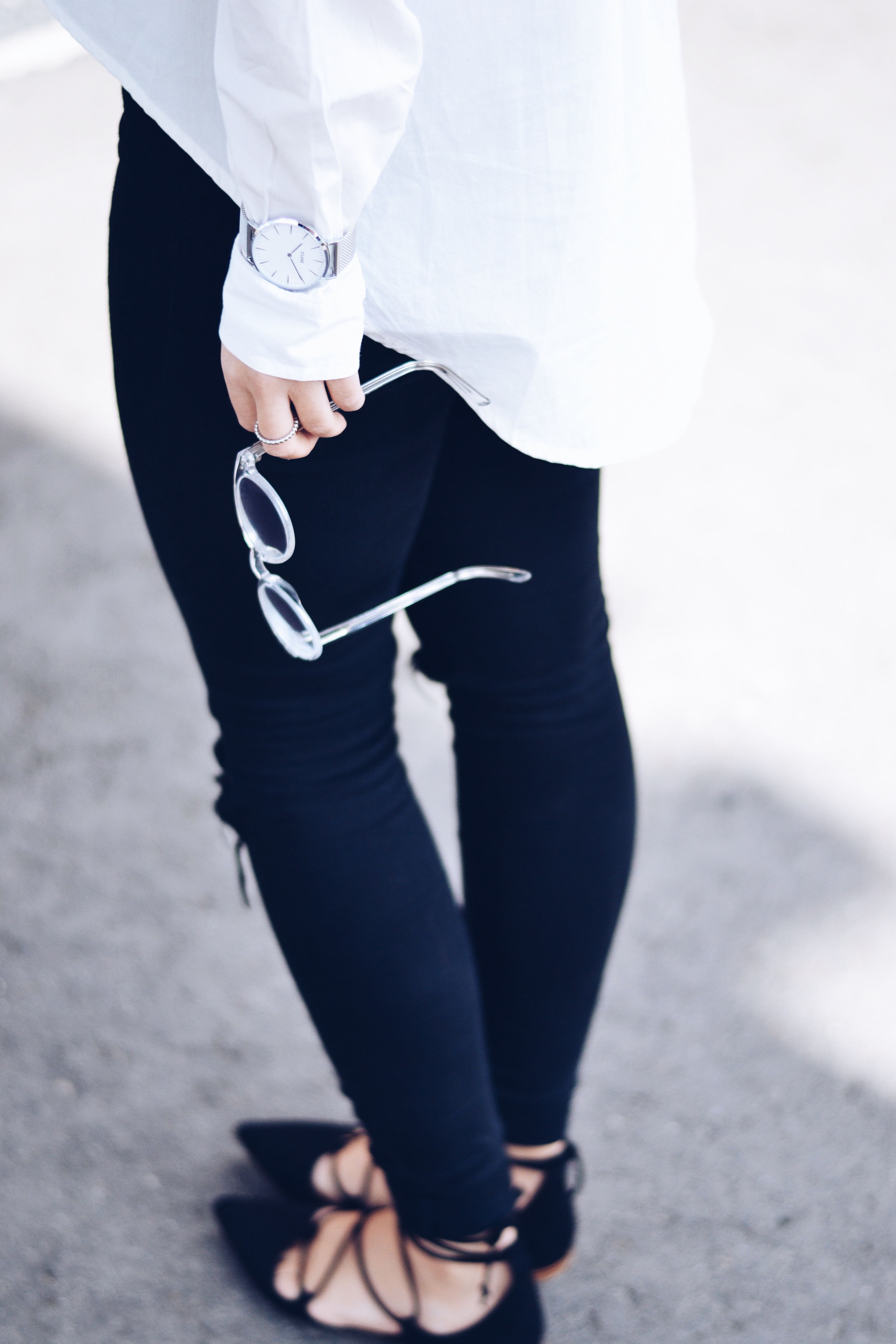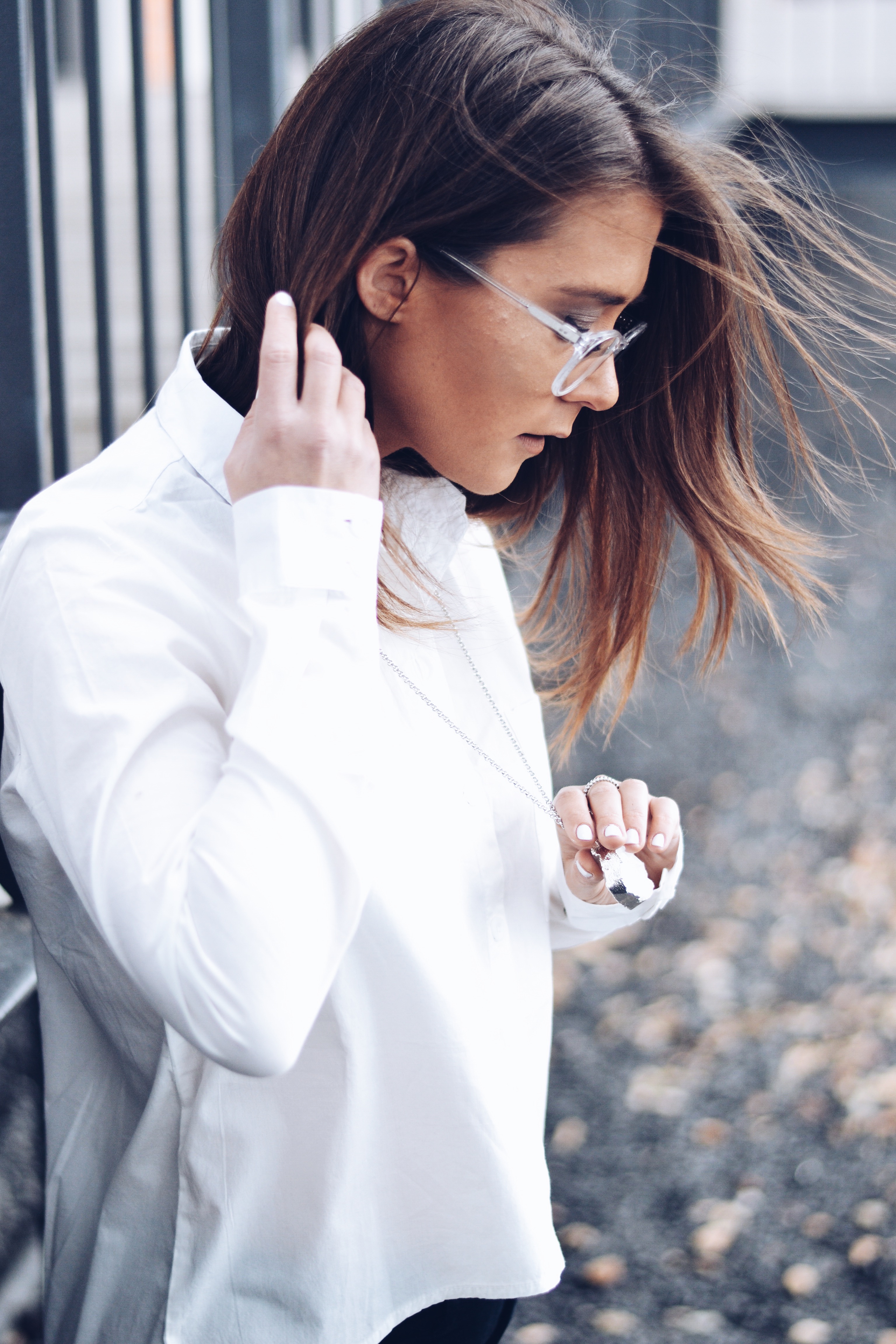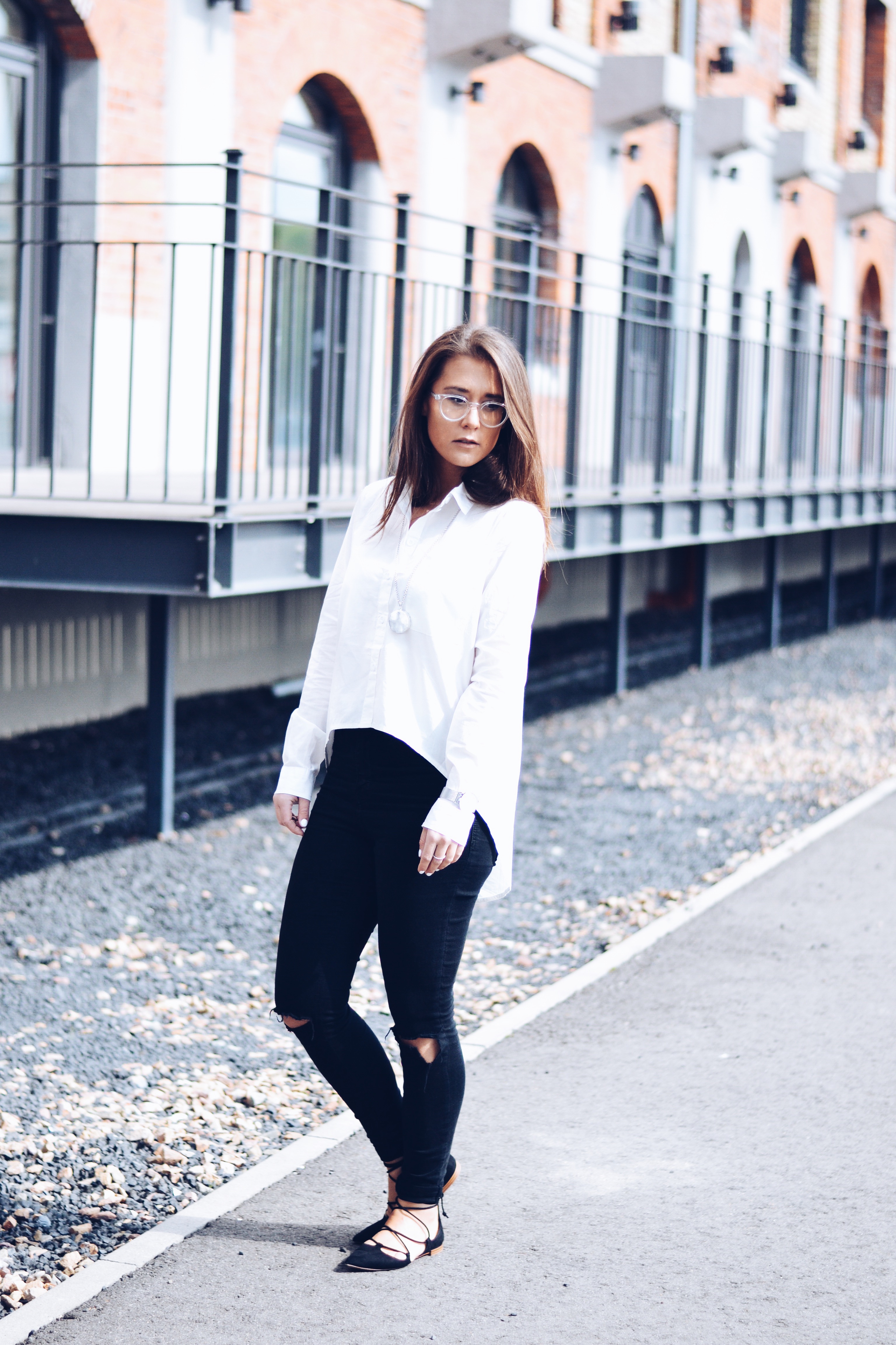 Da ich ja nun gut 1 1/2 Monate vollzeit berufstätig bin, habe ich mir in der letzten Zeit morgens vor dem Kleiderschrank so meine Gedanken über lässige Businessoutfits gemacht. Da ich bei einem Start-Up arbeite, haben wir natürlich einen sehr lockeren Dresscode, (wenn man es überhaupt Dresscode nennen kann) aber trotzdem kann eine Bluse im Büro nie so ganz schaden 😉 Da ich so rein gar nicht der Typ für die klassische weiße Bluse bin, habe ich mich online einmal etwas genauer nach einem passenden Modell für mich umgesehen und bin bei ABOUT YOU fündig geworden. Diese wunderschöne High Low Bluse von Noisy May hat mich vom ersten Moment an umgehauen. Ich kombiniere sie hier mit einer High Waist Skinny Ripped Jeans (Was ist das bitte für ein Wort 😉 ) und Lace-Up Flats. Für etwas mehr Seriosität sorgt meine absolute Lieblingsbrille von ace&tate, die dezent, und trotzdem außergewöhnlich ist. Mittlerweile bleiben die Kontaktlinsen dank ihr auch des öfteren mal in ihrem Wasserbehälter im Bad stehen. Die passende atemberaubende Kette ist von Cor:tt und die Uhr von Cluse.
